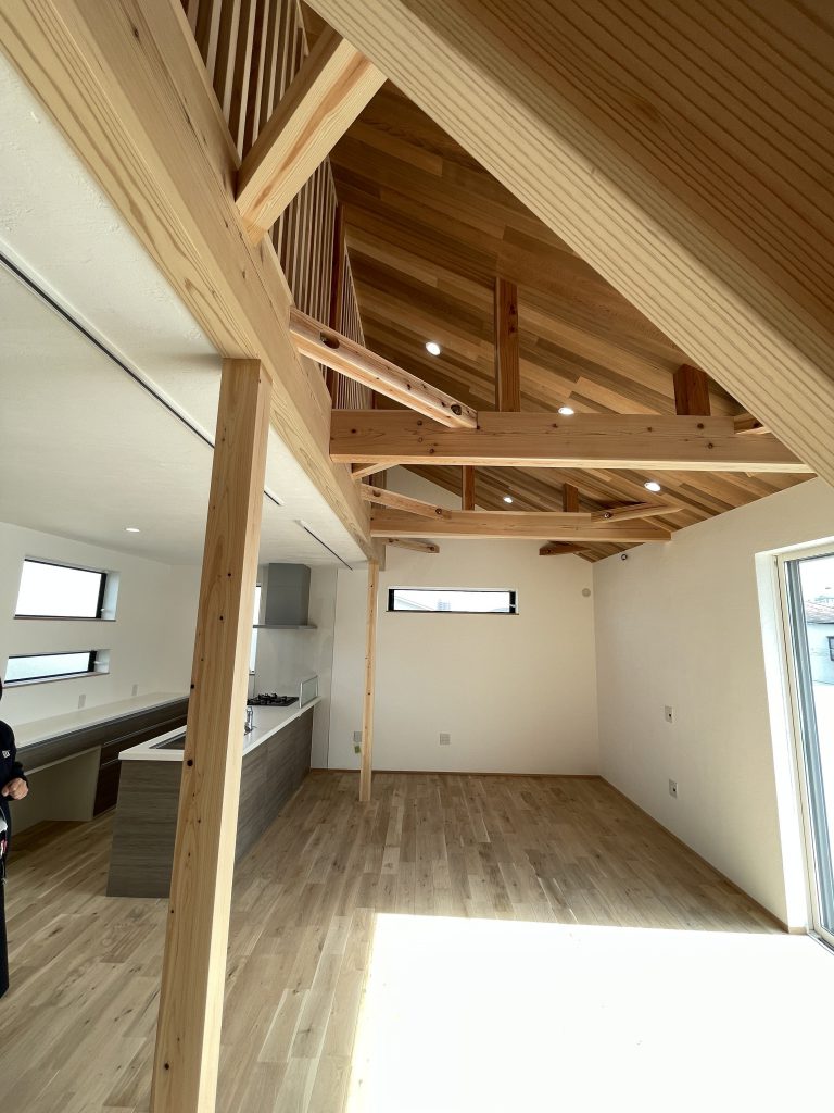 東側からリビングを見ると・・・構造躯体の柱が化粧で見える、ロフトの格子が全面に見える。いい感じです。