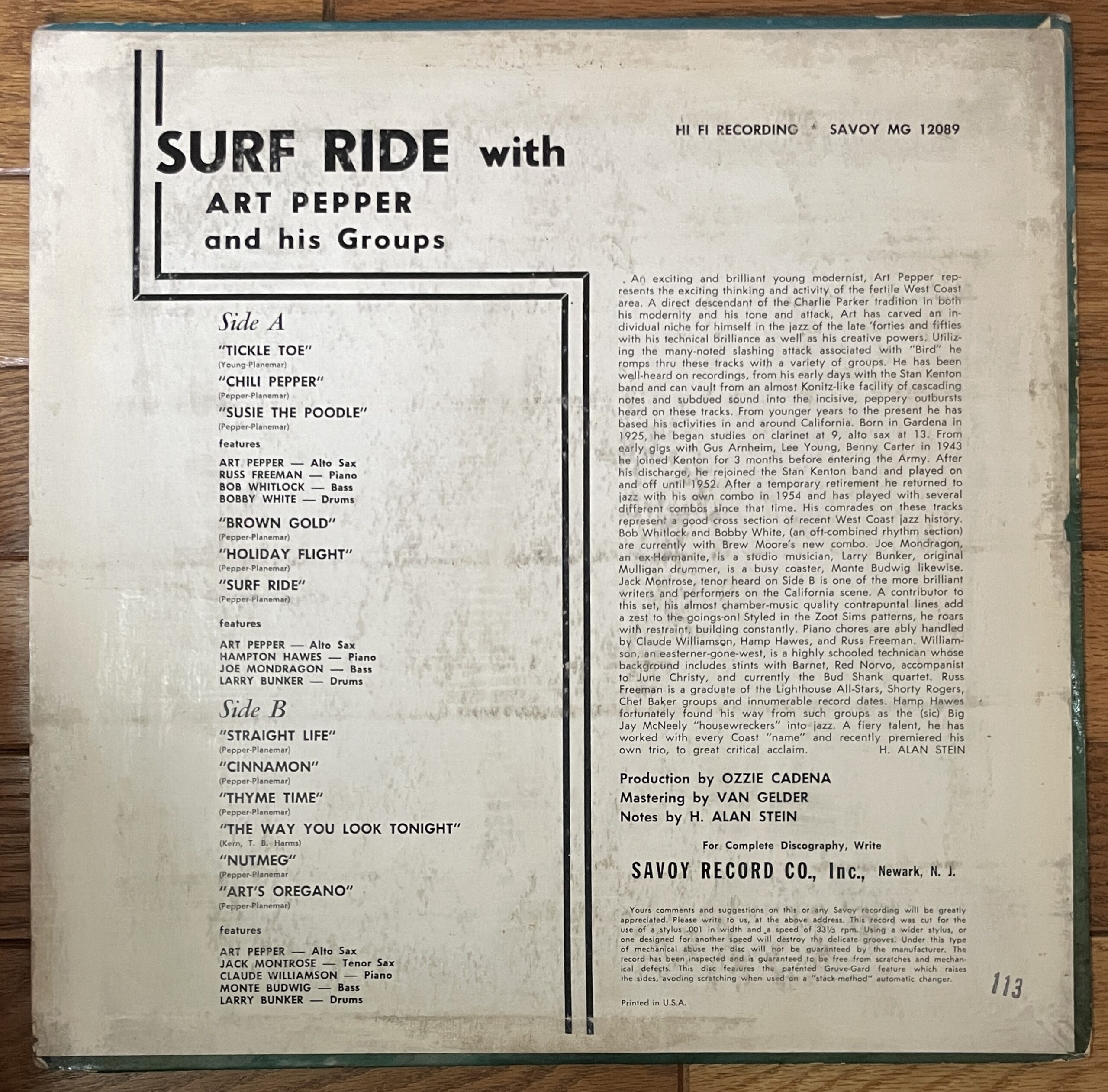 若さ爆発と言いたくなる初期のペッパー。躍動しまくっています。まさに全盛期の録音。このディスカバリー10インチのペッパーは2枚あり、それを集めた12インチLPがSavoyからイシューされた「Surf Ride」。