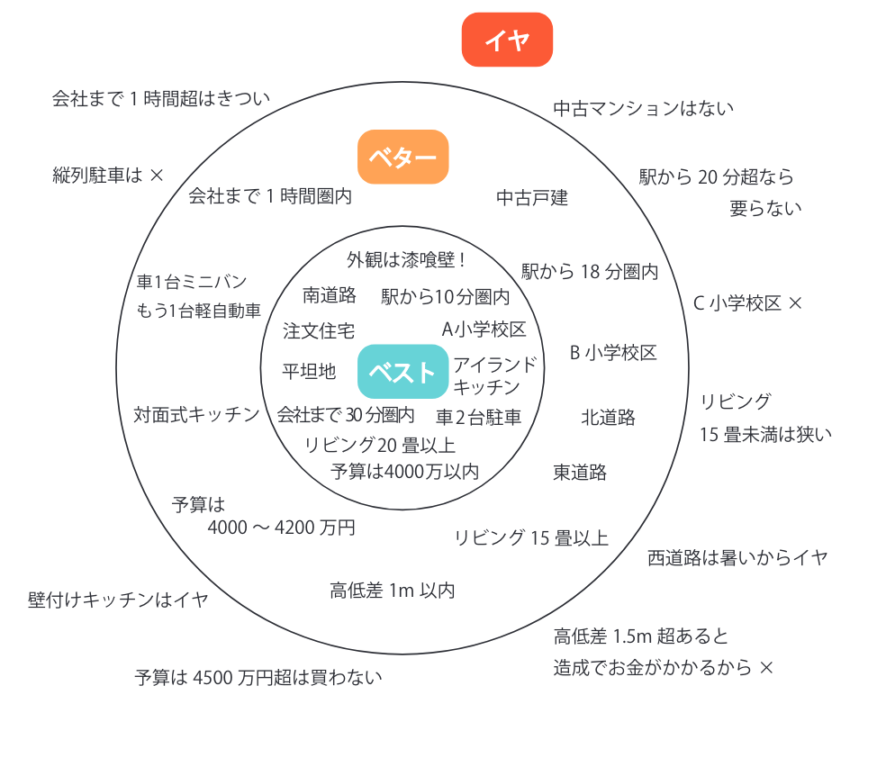 このように人の考え方は曖昧なところがあります。それは誰でもです。仕方ないです。そこを可視化してはっきりさせると目標が定まるのです。書くという行為が本当に減りましたが、大金を投じるのが建築・不動産なのでここはアナログで書くのをお勧めします。