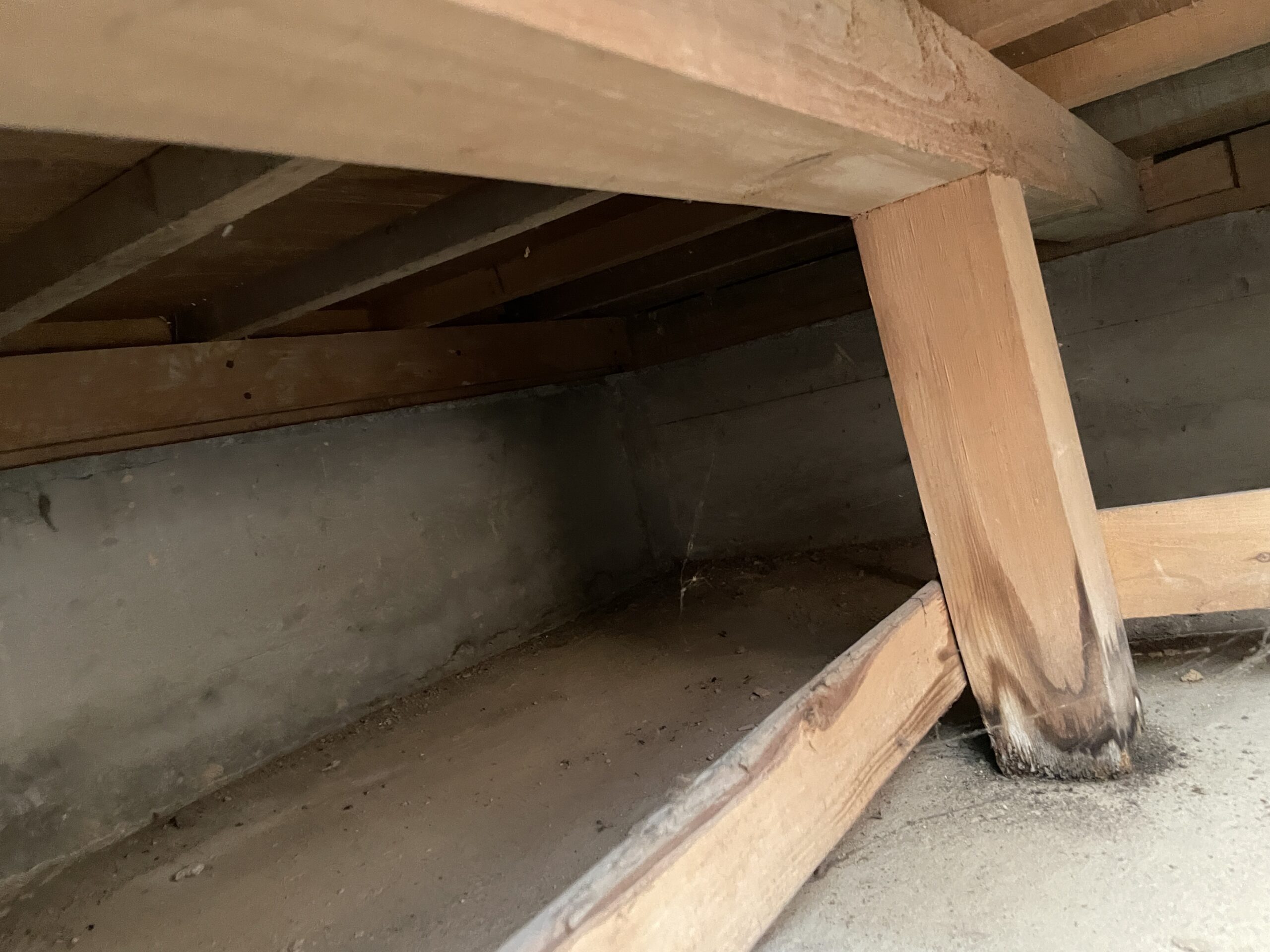 中古戸建の物件をチェック。床下の大引きを支える床束材。土間のコンクリート部分が腐朽菌発生して腐朽しています。