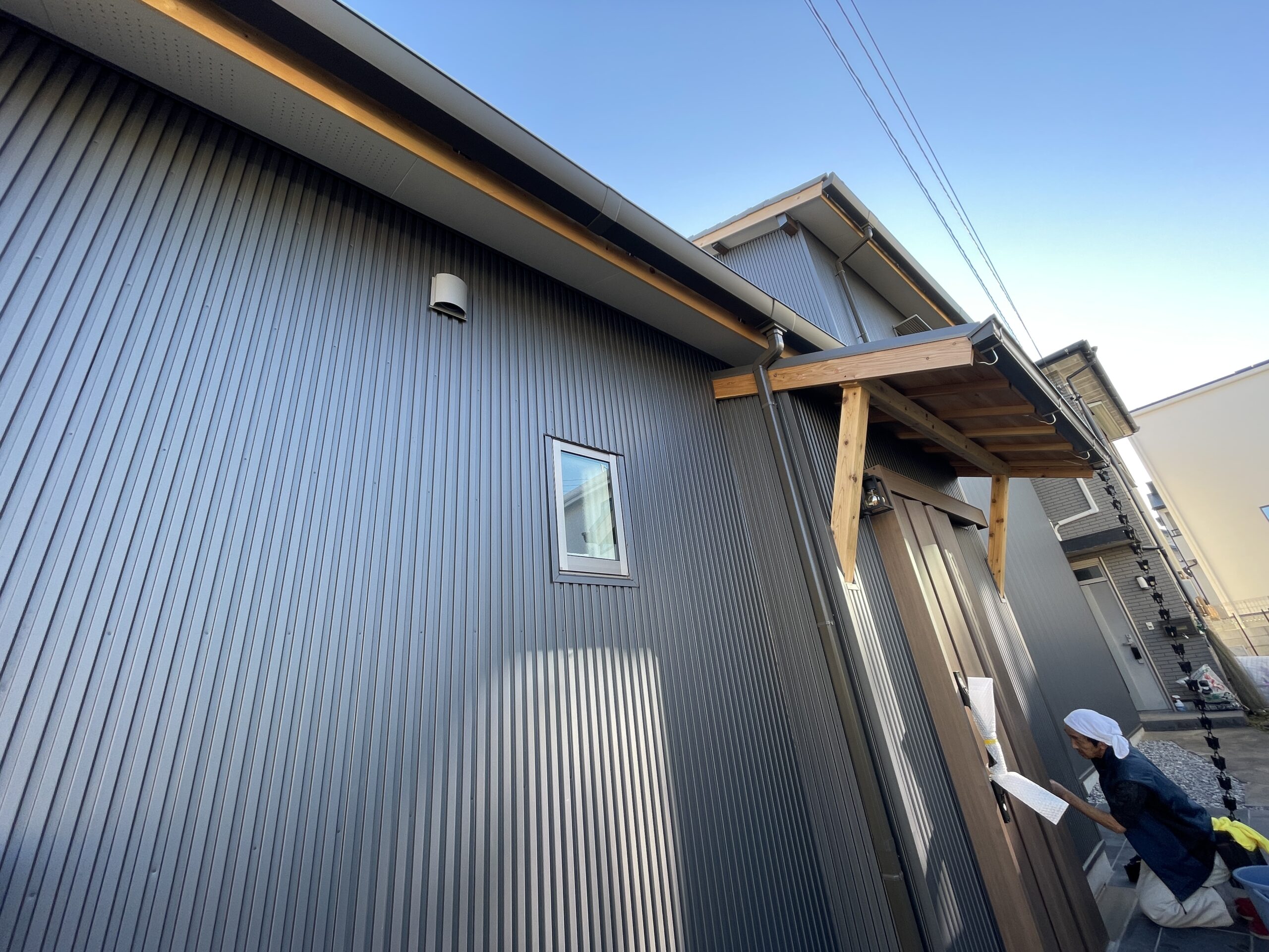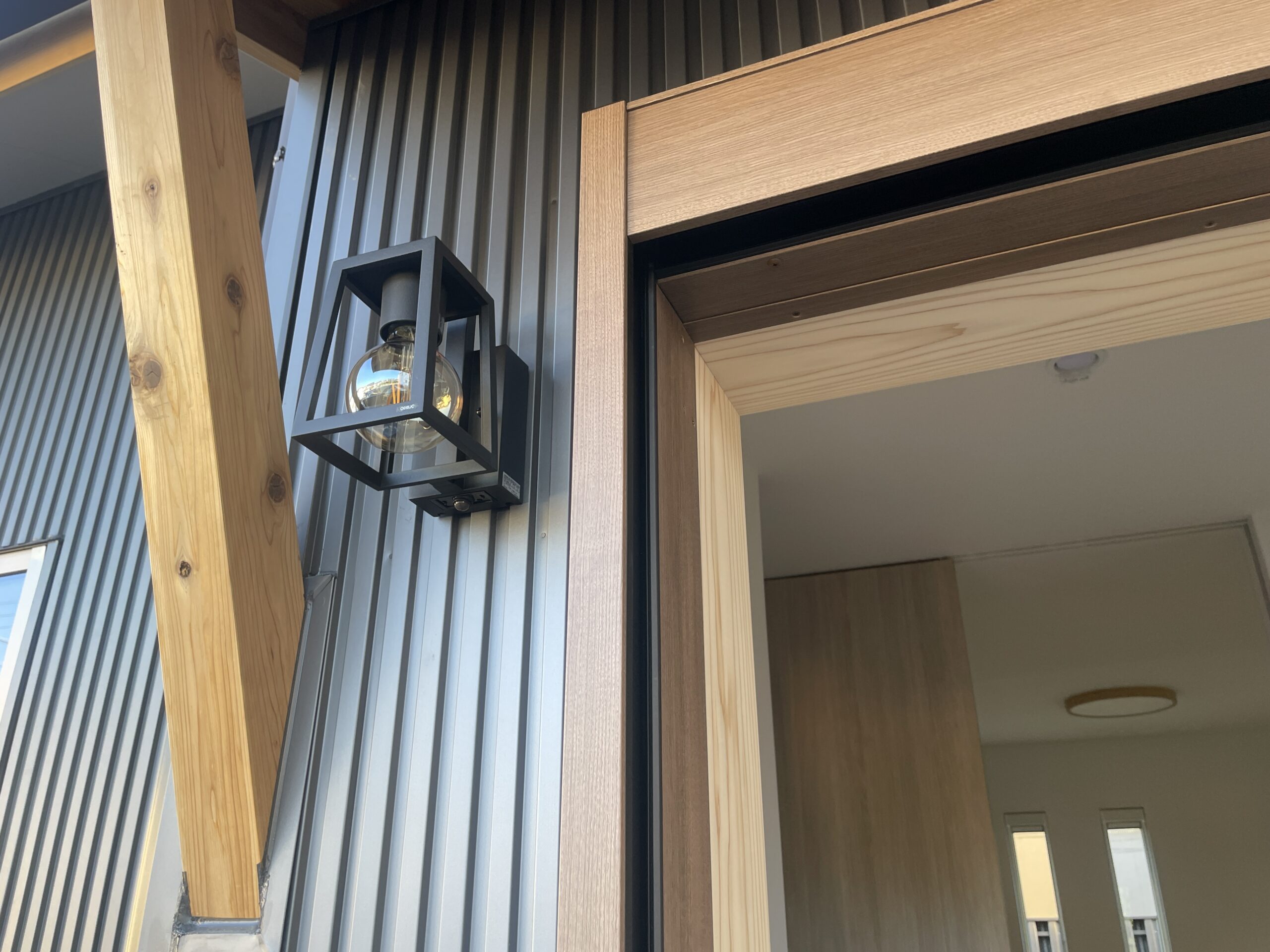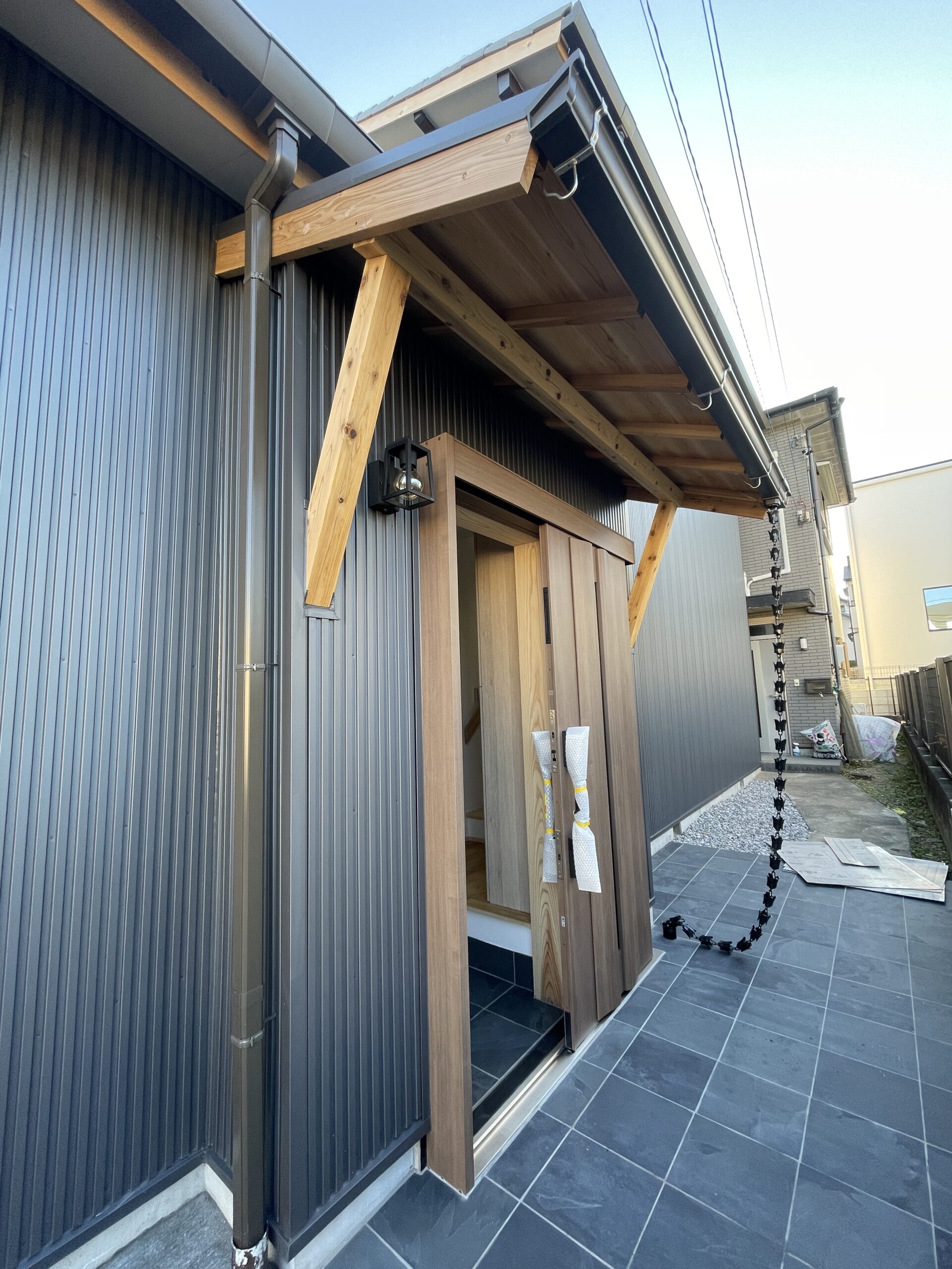 破風は桧化粧。方杖・桁も同じく。軒天井は杉羽目板。樋は飾り樋(まだ長さ調整していないけどね)。玄関は引き戸に変えてすっきりしました★