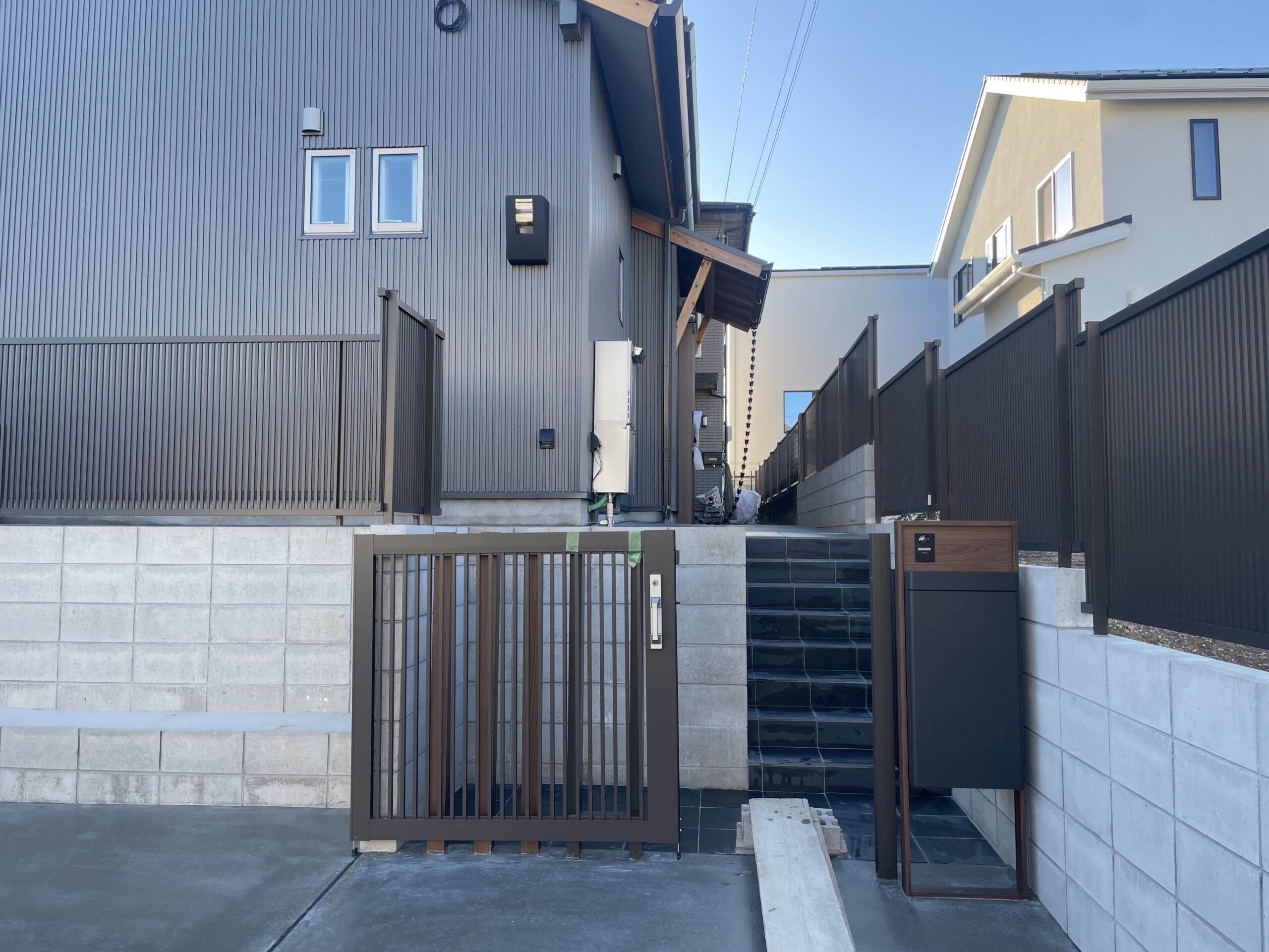 アプローチは引き戸式門扉&宅配ボックス付き機能門柱。