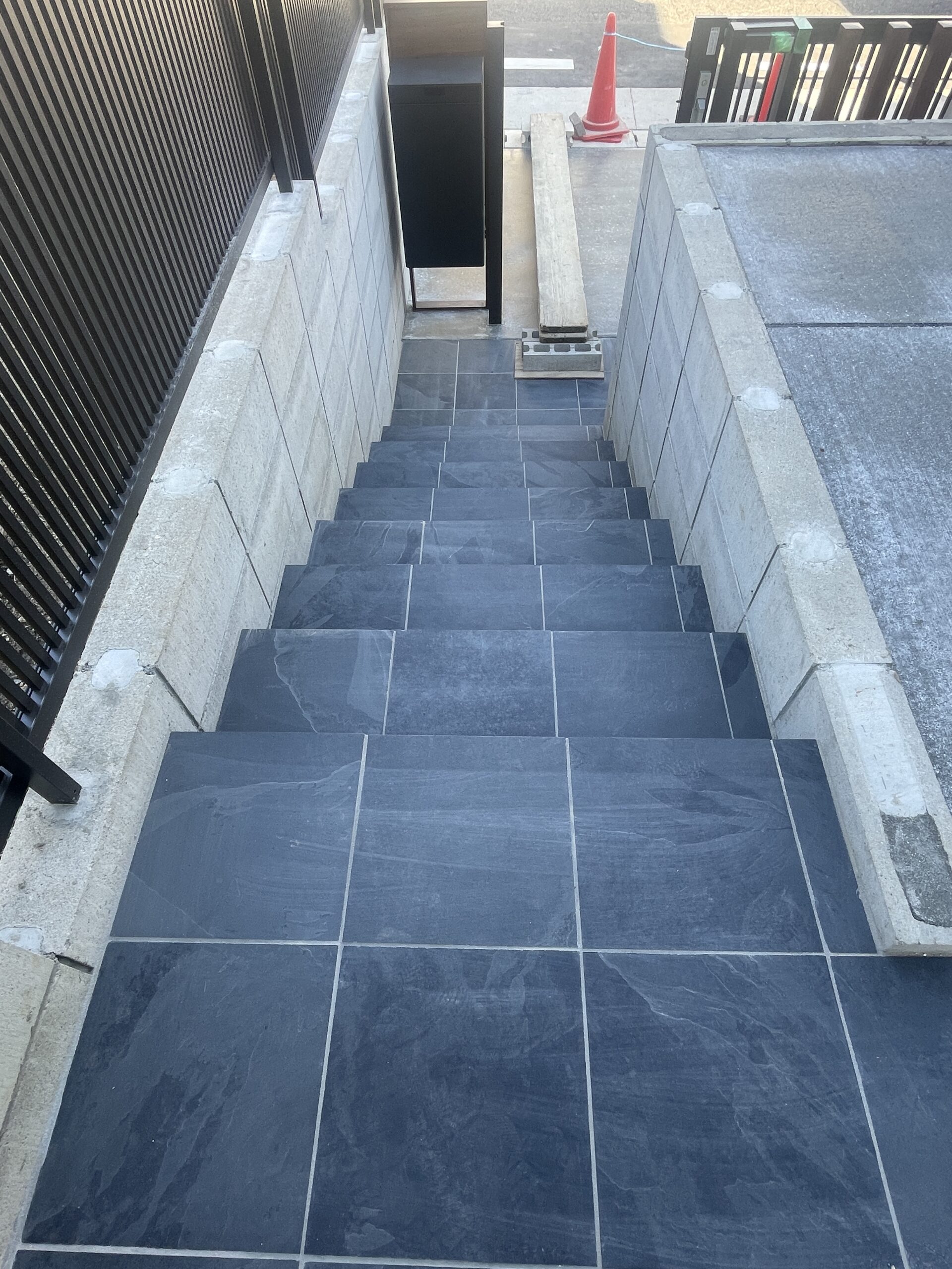 玄関土間からアプローチはクールーフ300角仕上げ。石だよ、石。タイルじゃないです。