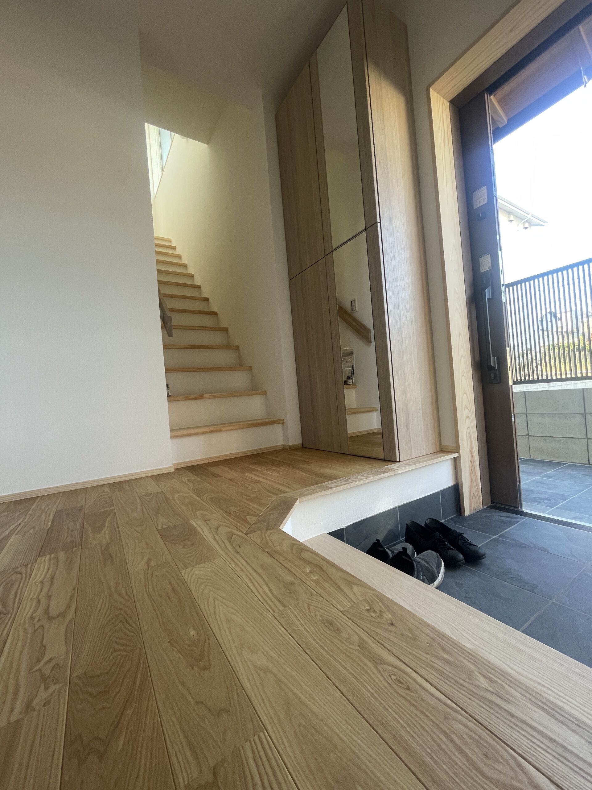 内部を簡単ですが、ご紹介。姿見ミラー付き玄関収納。式台もたも巾接材。