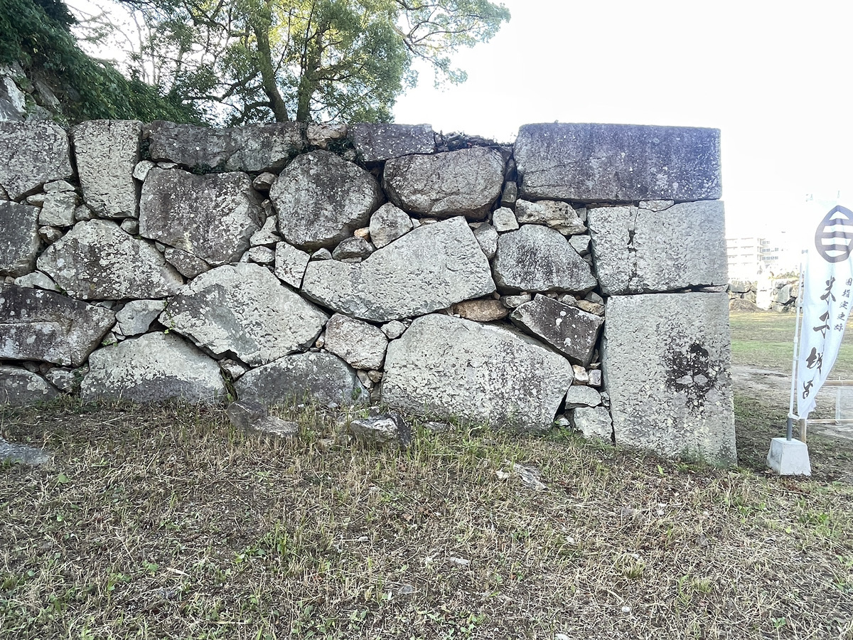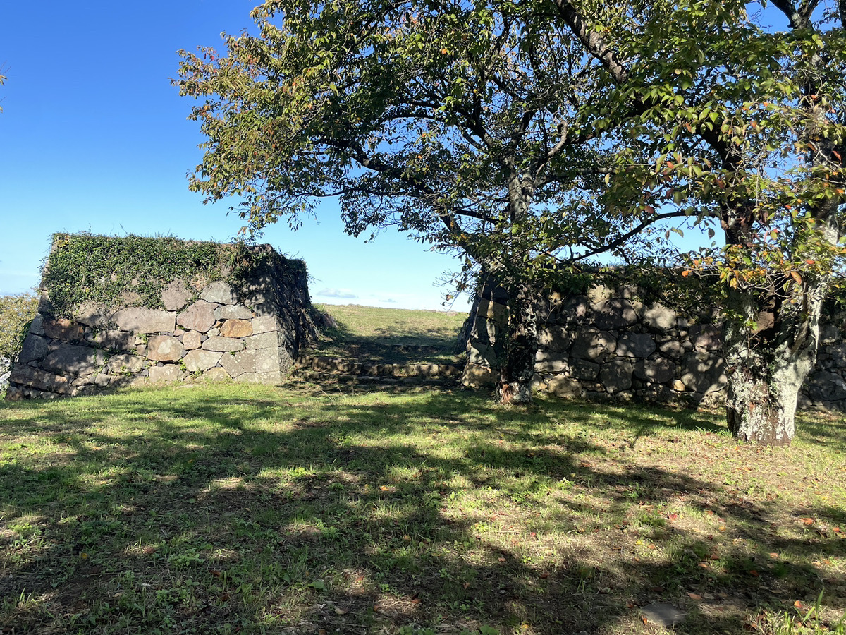 正面の石垣と左の石垣の上には土塀や櫓があり、階段の曲がったところには門があったのでは?