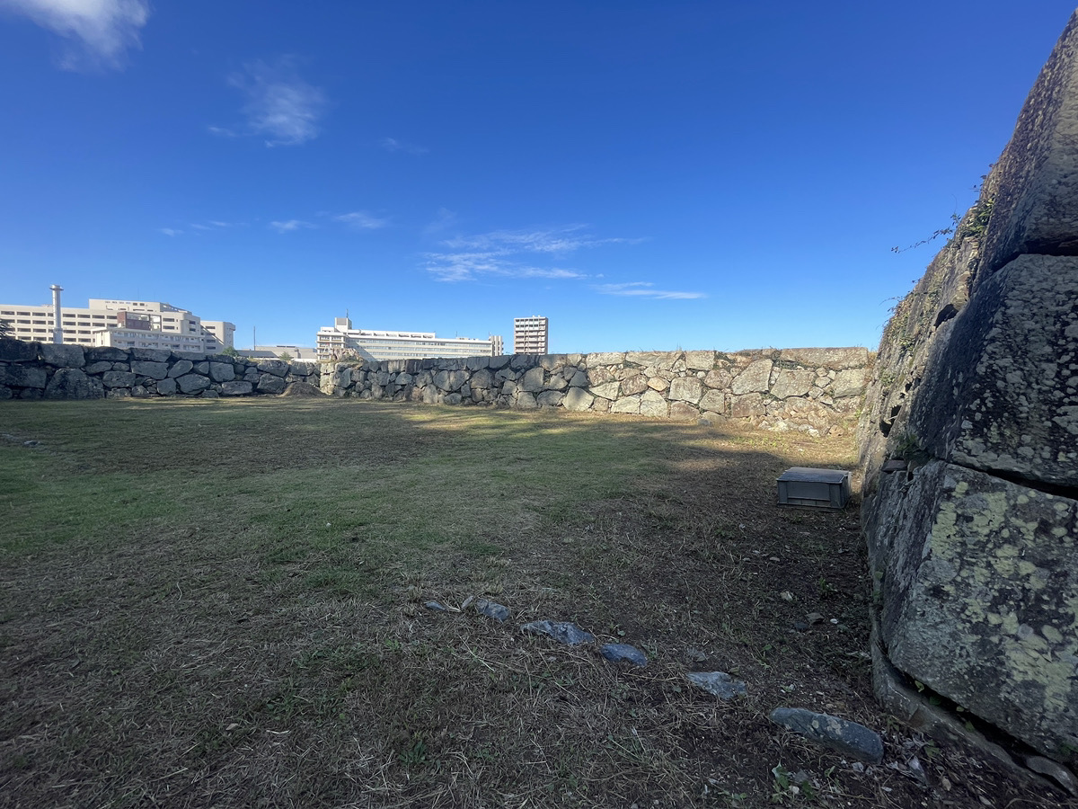 飯山から、湊山、丸山の北側まで巡る、内堀で囲った広い郭で、番士詰所、作事方詰所、馬屋、米蔵などの施設や馬場もありました。
