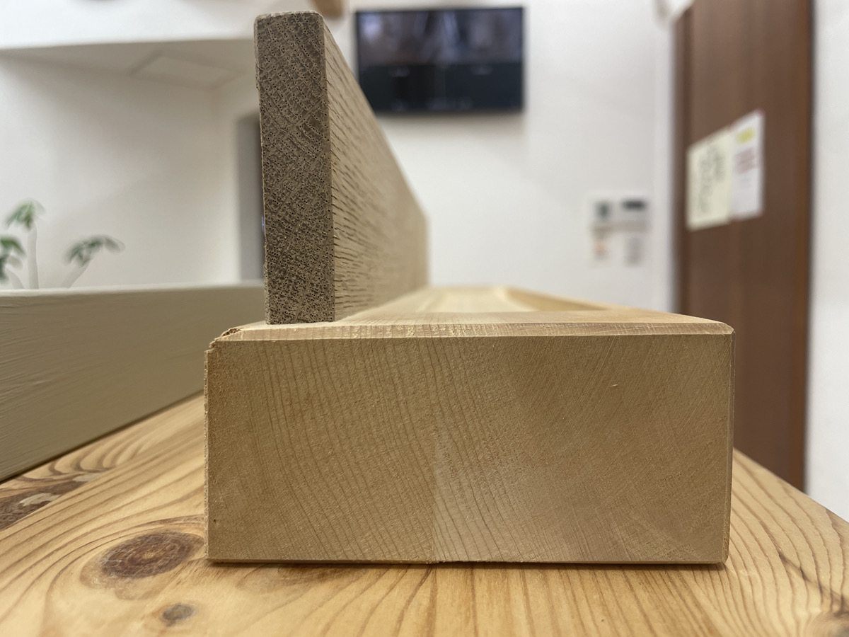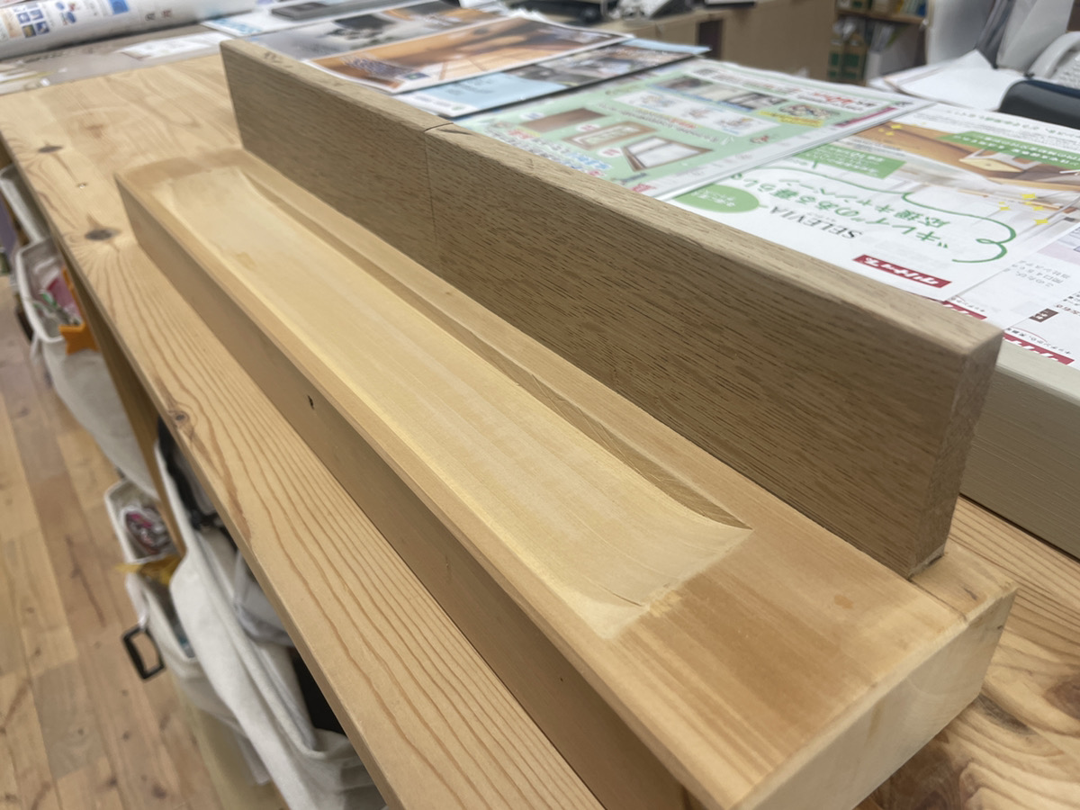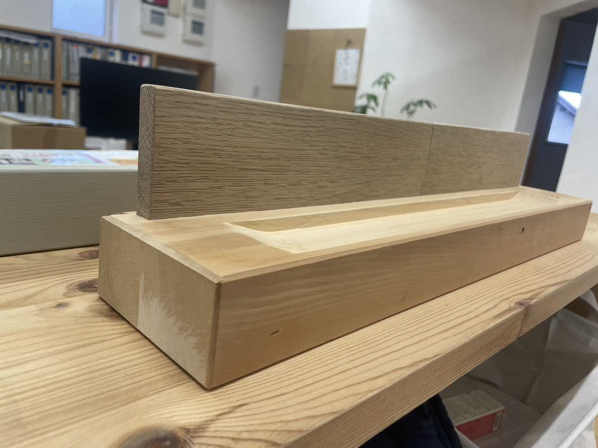 壁になっているのは古いナラのフローリングの残り材。下の台は玄関上がり框に使ってあったヒバの玄関框。