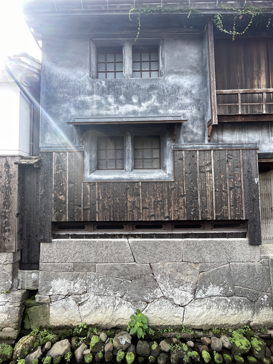 倉敷も同様な焼き板の街並み。昔の人はちゃんとわかっててやっていることが多い。何でもかんでも力づくになる現代人とは随分と違う。そのモノを活かす知恵が凄かったんですね。