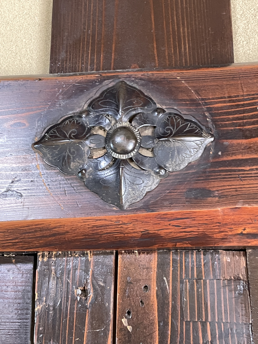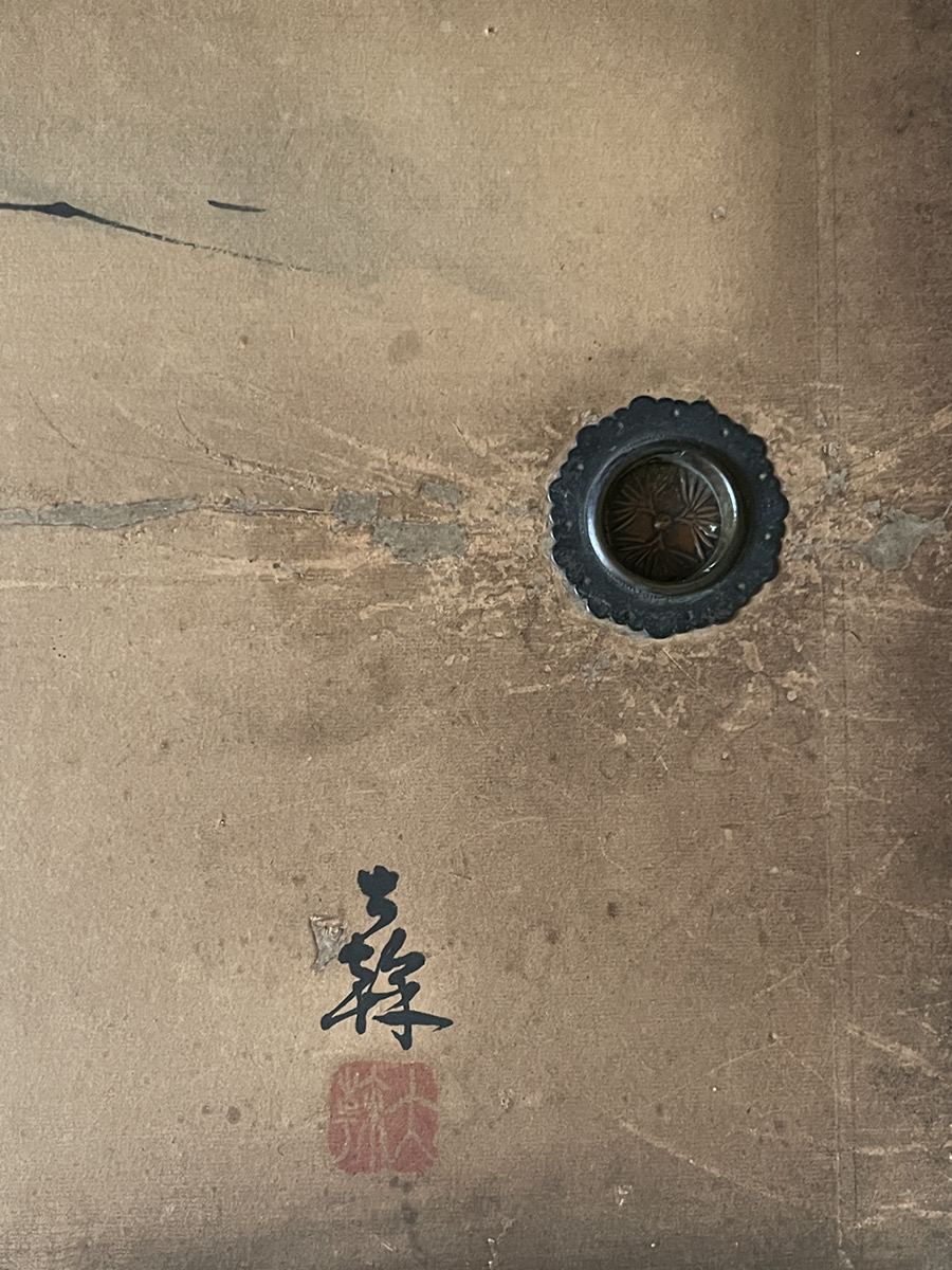 引手。何とも手の込んだデザイン。こういうものが廃棄されているのは悲しいです。価値がわからない人はただの金物になってしまう。どれほど手間暇がかかっていることか。当時の職人と会いたいです。襖紙には墨で雅号と落款もある。