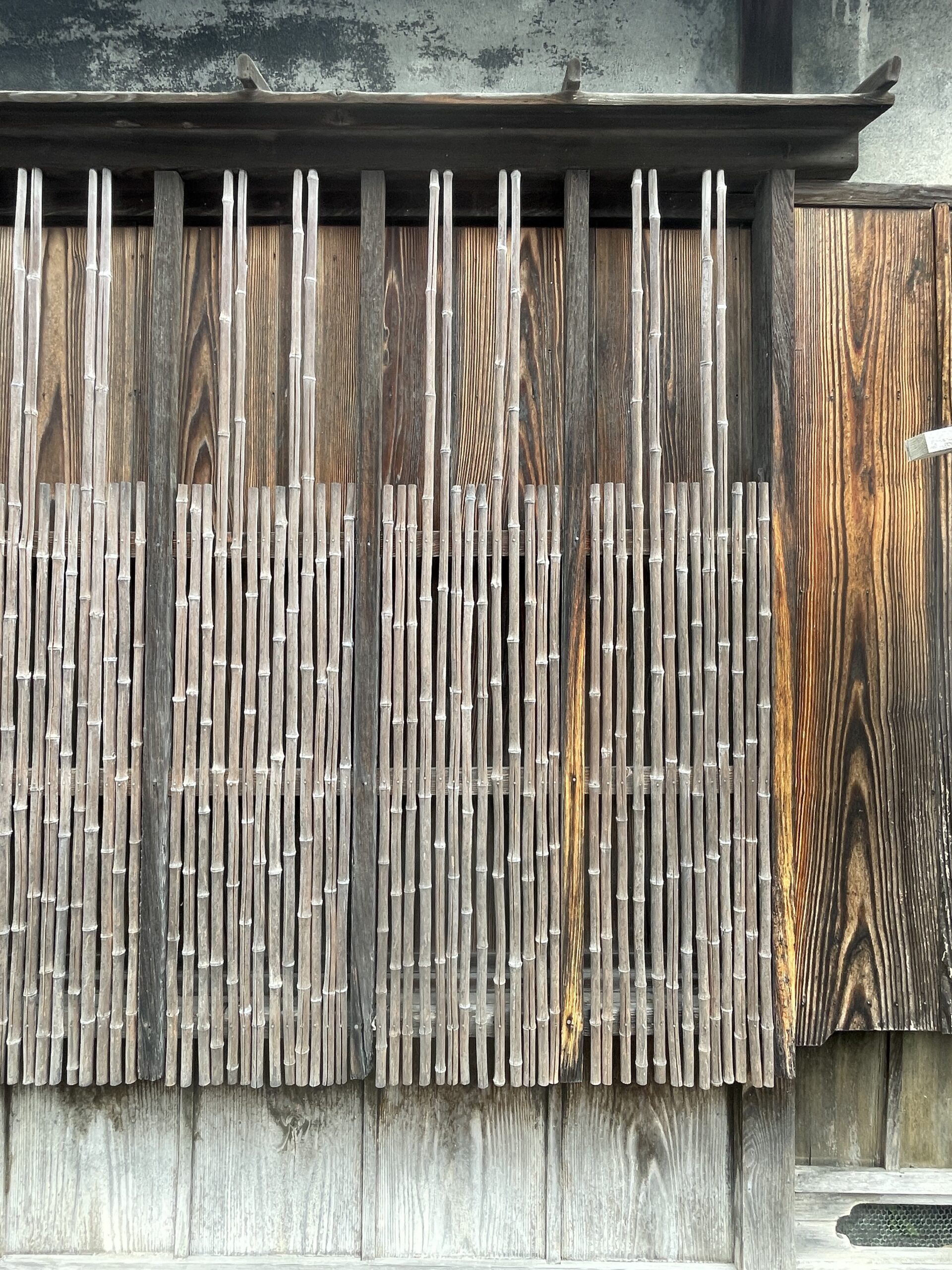 京の町屋は角材の縦格子だけど、これは竹を半割にして縦格子にした素朴なもの。